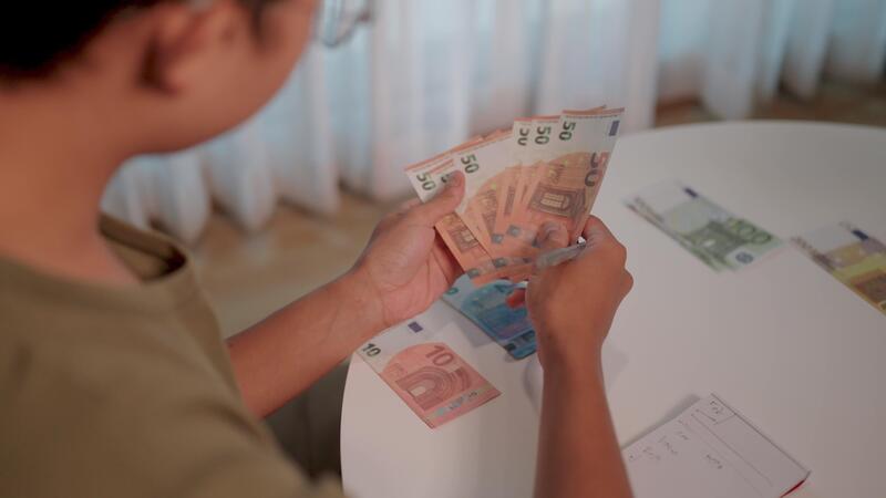 Counting currency a person hands carefully counting and sorting various banknotes, focusing on the detail of the currency and the careful handling. Pro Video