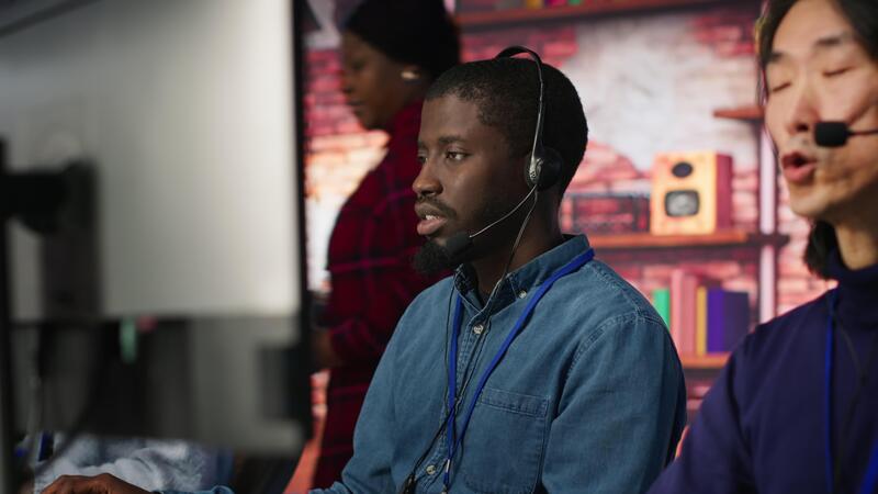 Call center agent helping customers regain access to accounts, diagnosing problems. Customer center staff member assisting clients needing help, providing accurate information, camera A Pro Video