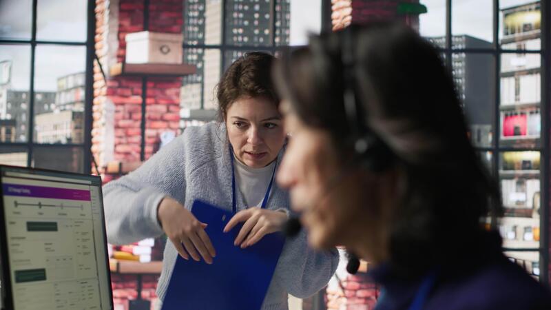 Team leader overseeing work done by call center agent tracking shipments in office. Customer center manager supervising worker locating clients packages and provide status updates, camera A Pro Video