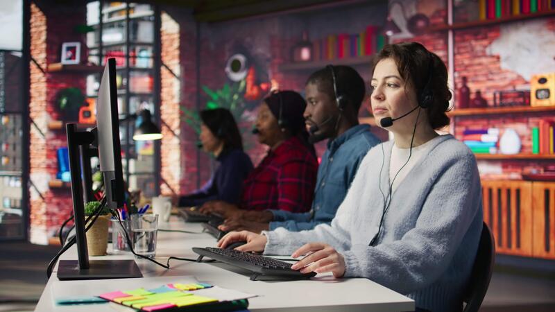 Teamworking call center coworkers in office helping customers by answering questions. Team of agents in customer support workplace in front of PC using headset mic to talk with clients, camera B Pro Video