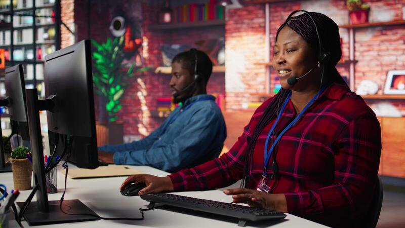Upbeat call center agent provides guidance to customers, answering questions. Jolly African american customer center worker at PC desk walking clients through technical solutions during call, camera B Pro Video