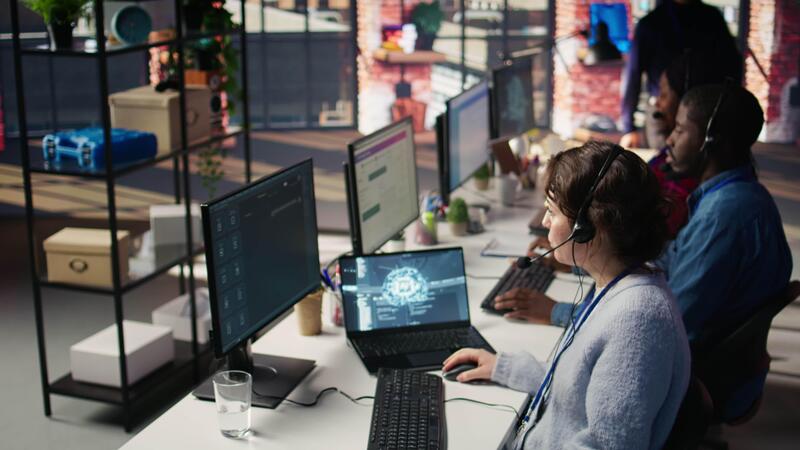 Technical support specialist in call center office doing troubleshooting helped by artificial intelligence tech. IT worker fixing customer connectivity issues using AI LLM chatbot, camera B Pro Video