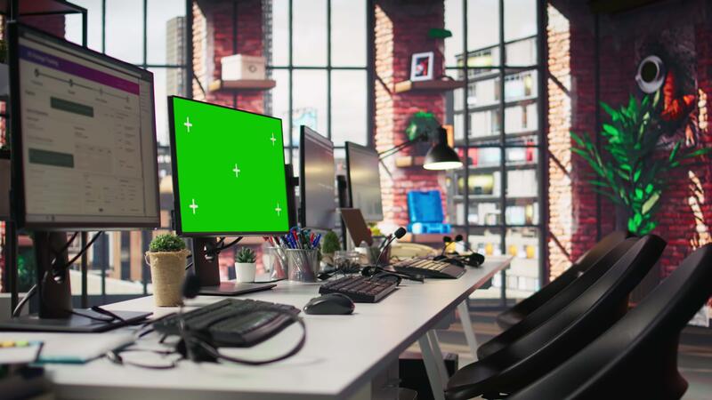 Customer support office with green screen PC used to assist customers with technical issues and diagnosing problems. Call center workspace with chroma key computer used to do complaint resolution Pro Video