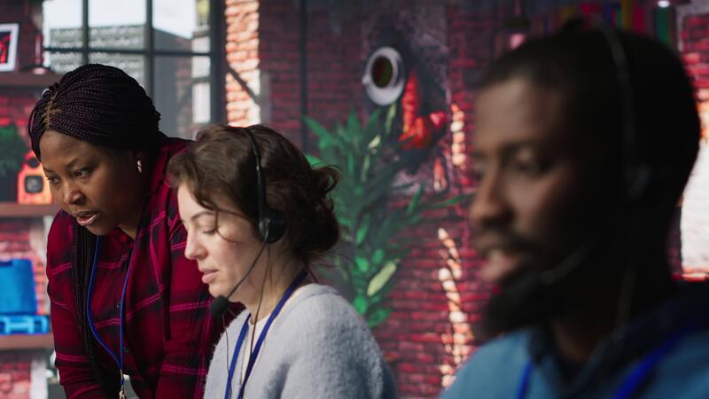Diverse customer center workers assisting clients with installing software. Multiethnic team of call center agents using remote access tools to connect to customer devices, fixing errors, camera A Pro Video