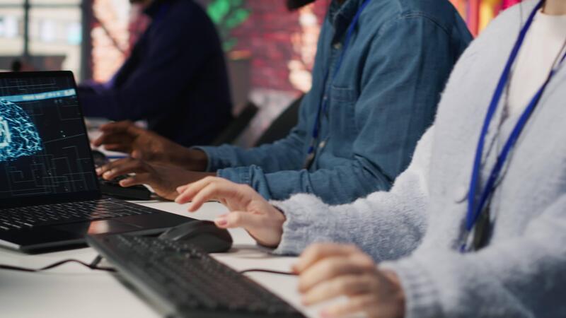 Call center worker using artificial intelligence customer service management software. Customer service agent using AI technology to log customer interactions in CSM system, camera A Pro Video