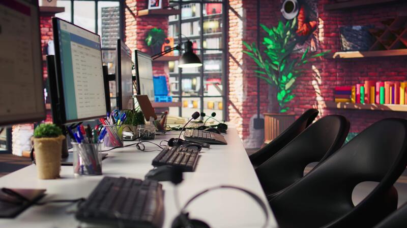 Customer support office with PC devices used to assist customers with technical issues and diagnosing problems. Call center workplace with computer used to do complaint resolution Pro Video