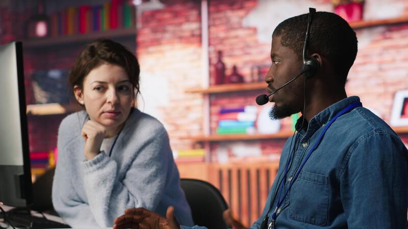 Call center manager supervising agent providing step by step guidance to customers. Customer center supervisor overseeing work done by employee walking clients through technical solutions, camera A Pro Video