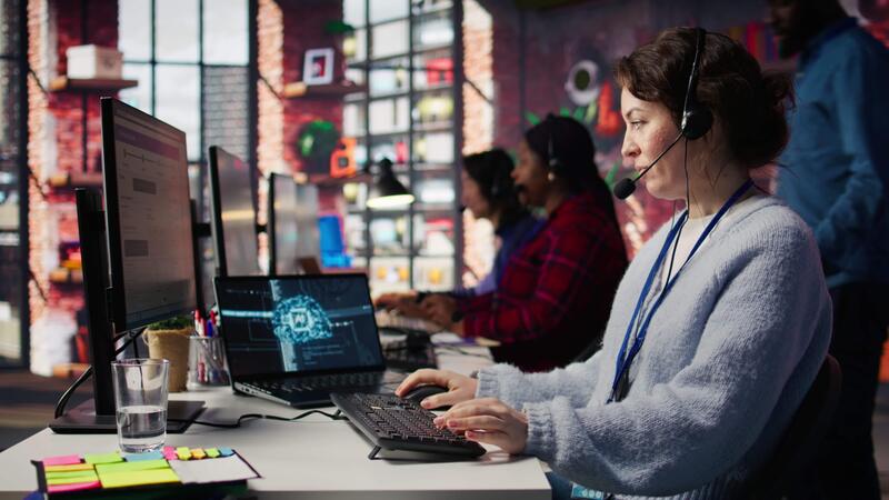 Call center agent uses artificial intelligence to enhance customer interactions and resolve inquiries efficiently. Woman in customer service office using AI communication technologies, camera B Pro Video