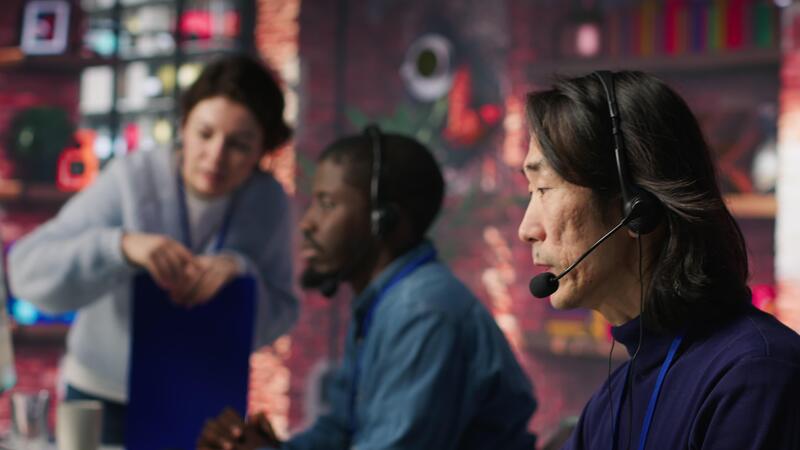 Call center agent speaking in audio headset microphone, using remote access tools. Worker in customer center assisting clients with installing software, communicating through headphones mic, camera A Pro Video