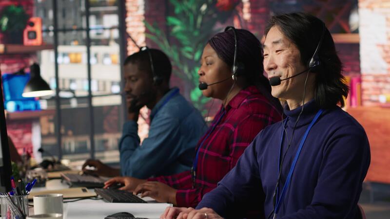 Multiethnic team of call center agents answering clients technical inquiries about hardware issue. Multiracial customer support workers in office doing job using PC to troubleshoot problems, camera A Pro Video