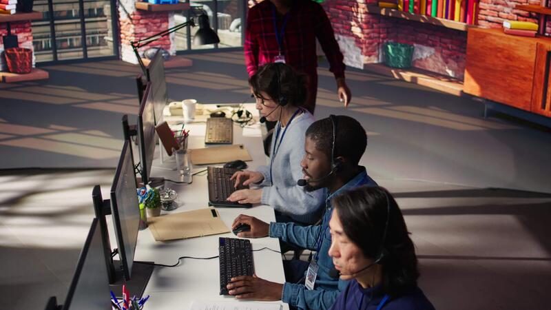 Team of multiethnic call center agents in workplace helping customers. Multiracial workers in diverse customer center assisting clients needing help resetting password, camera B Pro Video
