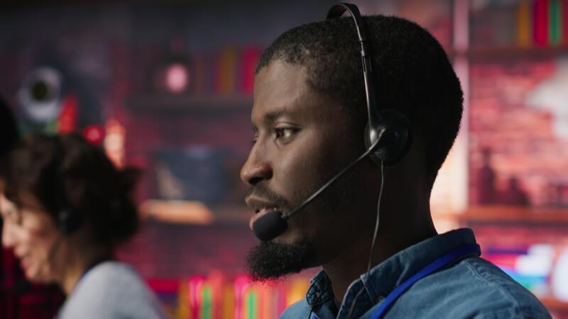 Smiling call center agent dealing with unhappy customers, speaking with them using audio headset at office desk. Customer support worker handling clients complaints in company workspace, camera A Pro Video
