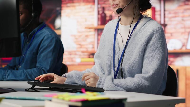 Call center worker speaking in audio headset microphone, using remote access tools. Woman in customer center assisting clients with installing software, communicating through headphones mic, camera A Pro Video
