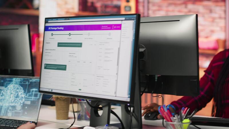 Call center worker tracking shipments at work, looking at computer screen, handling delivery delays. Customer center agent uses software to locate clients packages and provide status updates, camera A Pro Video