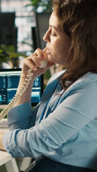 Vertical Worker in office using landline phone to talk with client while reviewing charts. Employee at work discussing with business partner during call, analyzing business performance metrics, camera A Pro Video