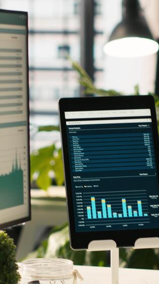 Vertical Modern workspace with key performance indicators data on display in bright office environment with potted plants. PC and tablet on desk with accounting figures displayed on screen, close up shot Pro Video