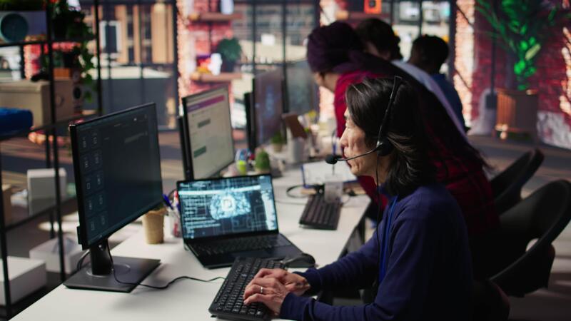 Call center agents track shipments in office using AI chatbot for help. Customer center workers use artificial intelligence assistance to locate clients packages and provide status updates, camera B Pro Video