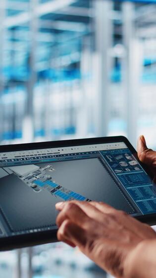 Vertical Industry 4.0 industrial plant engineer designs new robotic machines using CAD software on tablet. Smart factory technician using digital device app to do tooling for automation equipment, camera A Pro Video