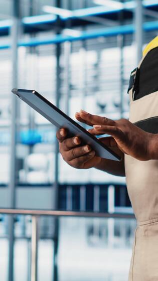 Vertical Smart factory expert using digital device app to test automated systems and ensure reliability. Worker uses tablet to identify bottlenecks and optimize gear based on sensors data, camera A close up Pro Video