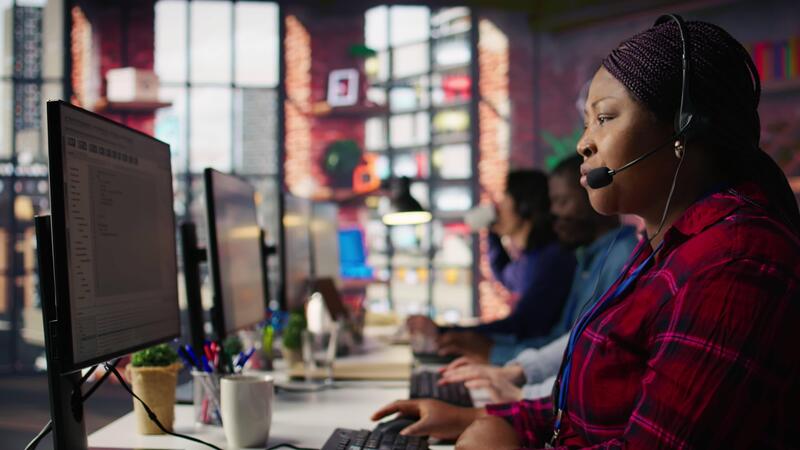 IT support expert at PC in call center office troubleshoots errors to minimize downtime. Tech support agent at desk writing code, maintaining technical systems and infrastructure, camera B Pro Video