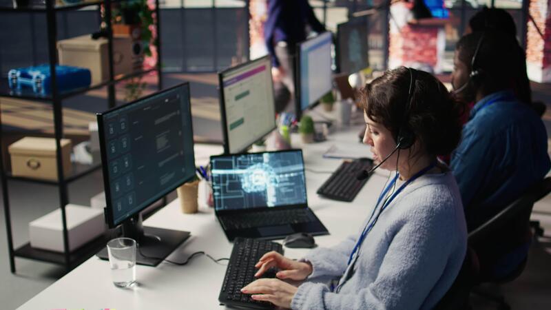Call center worker in office uses AI LLM assistant to reply to customer queries. Woman doing customer service job generating automated responses to clients using artificial intelligence tech, camera B Pro Video