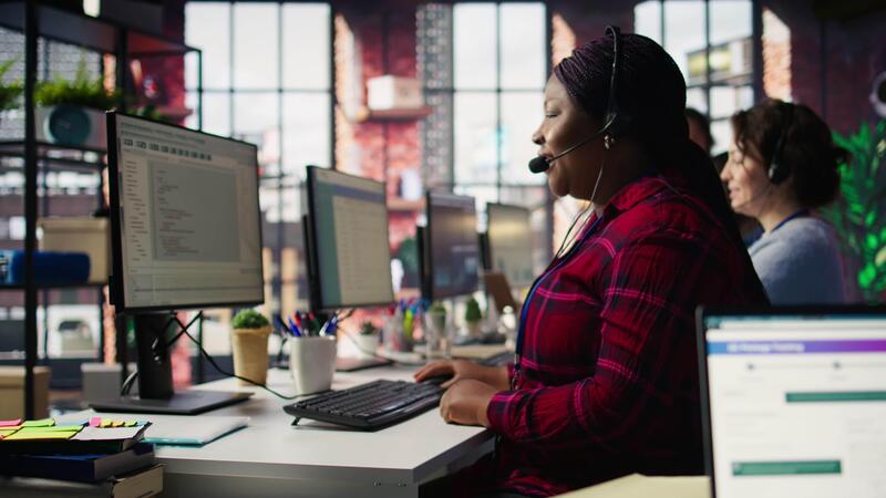 Call center staff member providing step by step guidance to customer. Customer center worker at computer desk walking clients through technical solutions during call, camera B Pro Video