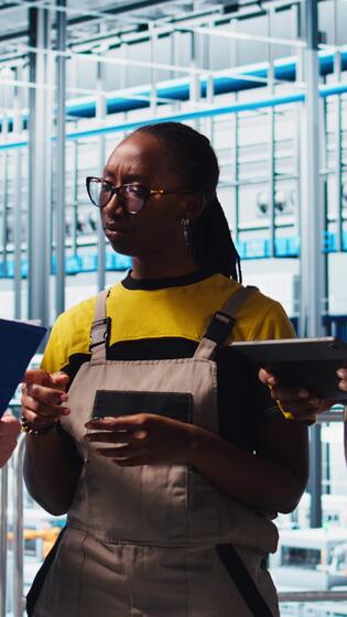 Vertical Smart factory team leader talking with employees overseeing operation of robotic arms on facility floor. Industry 4.0 plant workers doing brainstorming regarding troubleshooted errors, camera A Pro Video