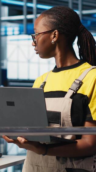 Vertical Smiling engineer overseeing smart factory, looking at collected metrics on laptop screen. Happy technician on platform in industry 4.0 industrial plant equipped with sensors using notebook, camera A Pro Video