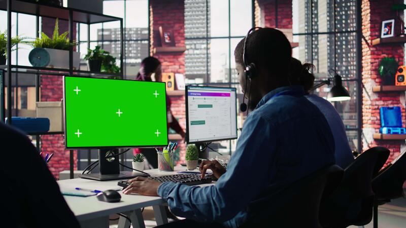 Technical support specialist in call center office doing troubleshooting using green screen computer. IT worker fixing customer connectivity issues using chroma key mockup PC, camera B Pro Video