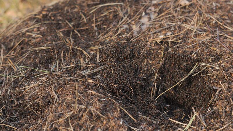 Close-Up of Active Anthill in Forest with Crawling Ants, Swarming forest ants moving on top of a large anthill built from pine needles and soil Pro Video