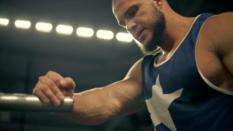 Bald athletic man beard focuses on leg exercises in gym. He engages in strength training using barbell build muscle and rest after hard exercise Pro Video
