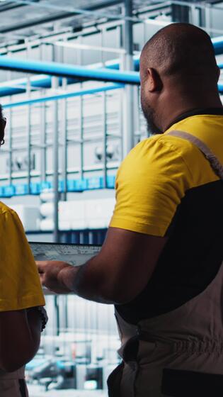 Vertical Teamworking smart factory colleagues doing brainstorming, programming automation equipment. Industry 4.0 plant employees working together to design robotic machines using CAD software, camera A Pro Video