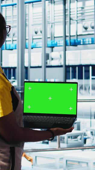 Vertical Smart factory professional implements automated workflows using isolated screen laptop, digitizing manual operations. Woman integrates sensors into production using mockup notebook, camera A Pro Video