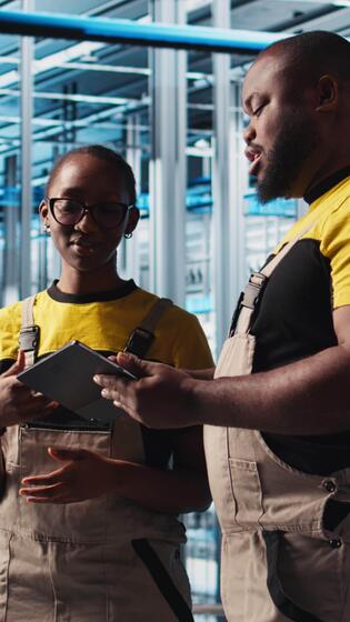 Vertical Smart factory engineering team brainstorming, testing automated systems to ensure reliability. Industry 4.0 industrial plant workers identify bottlenecks and optimize gear based on data, camera A Pro Video