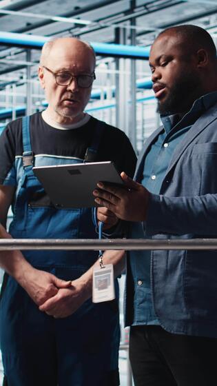 Vertical Engineers talking with manager overseeing smart factory, showing collected metrics. Technicians receiving feedback from supervisor in industry 4.0 industrial plant equipped with sensors, camera A Pro Video