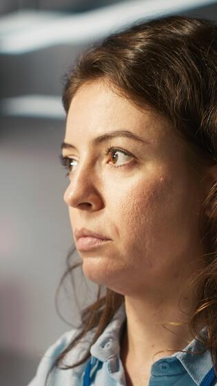 Vertical Close up of woman sitting at office desk, solving tasks during job shift. Office clerk doing email communication in workplace, researching data for company project, camera A Pro Video