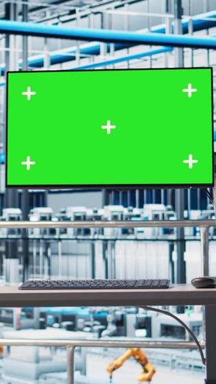 Vertical Green screen monitor displaying analytics dashboard for Industry 4.0 smart factory equipment. Industrial plant mockup display visualizing robotic arms performance and metrics from sensor data Pro Video