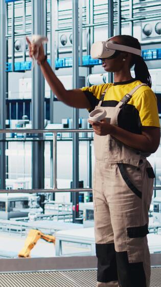 Vertical Industry 4.0 industrial plant engineer using virtual reality to control automated machinery, ensuring workflow continuity. Smart factory technician manages robotic arms using VR equipment, camera A Pro Video