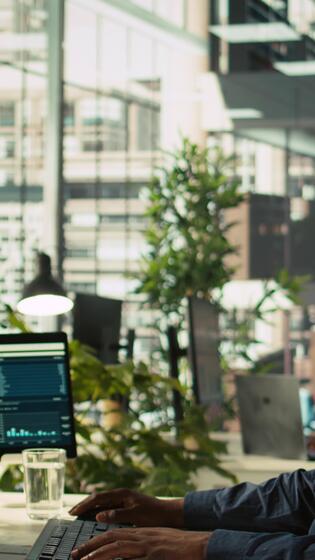 Vertical Employee in office showing revenue figures on laptop to manager. Accountant presenting company statistical numbers on notebook to supervisor after finishing job tasks, camera B Pro Video