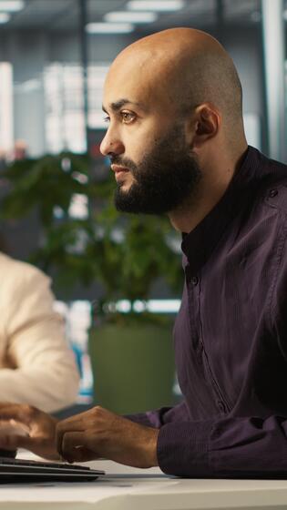 Vertical Arab man in office reviewing financial graphs, analyzing key performance indicators. Middle Eastern employee in workspace looking over data trends and strategic insights, camera A Pro Video
