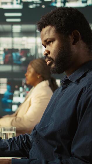 Vertical Close up of worker in office using landline phone to talk with customer. African american employee at work discussing with business partner during call, analyzing performance metrics, camera B Pro Video