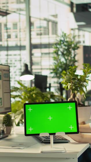 Vertical Close up of employee sitting at office desk, using green screen tablet to solve tasks during job shift. Office clerk doing email communication in workplace using chroma key device, camera B Pro Video