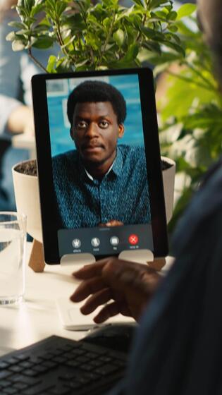 Vertical Worker in office talking with manager supervising tasks progression during online videocall. Employee discussing with supervisor overseeing work done during remote teleconference meeting, , camera A Pro Video
