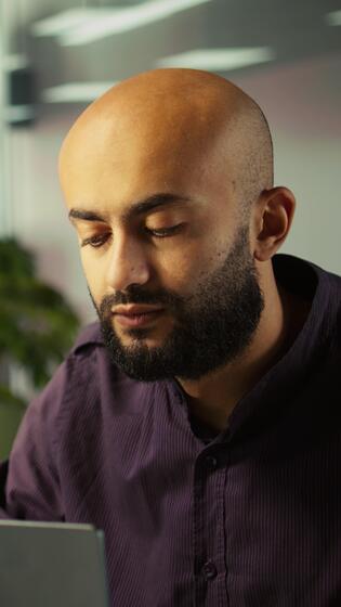 Vertical Smiling employee in warm office working on company project, multitasking. Cheerful freelancer answering emails, typing on keyboard, working in modern workplace, camera B close up Pro Video