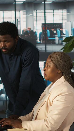 Vertical Teamworking colleagues analyzing data charts on computer screen at desk. Team of employees completing spreadsheets on desktop computer, inputting and analyzing data, camera A Pro Video