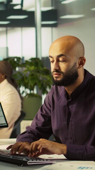 Vertical Accountant in busy modern startup agency working on PC, interrupted my manager asking him to check reports. Businessman working in office, tasked by supervisor to crosscheck paperwork data, camera B Pro Video