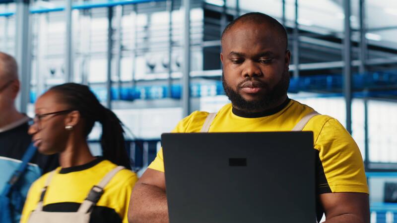Smart factory professional implements automated workflows and control systems using laptop, computerizing manual operations. Man integrates sensors into production using notebook, camera A Pro Video