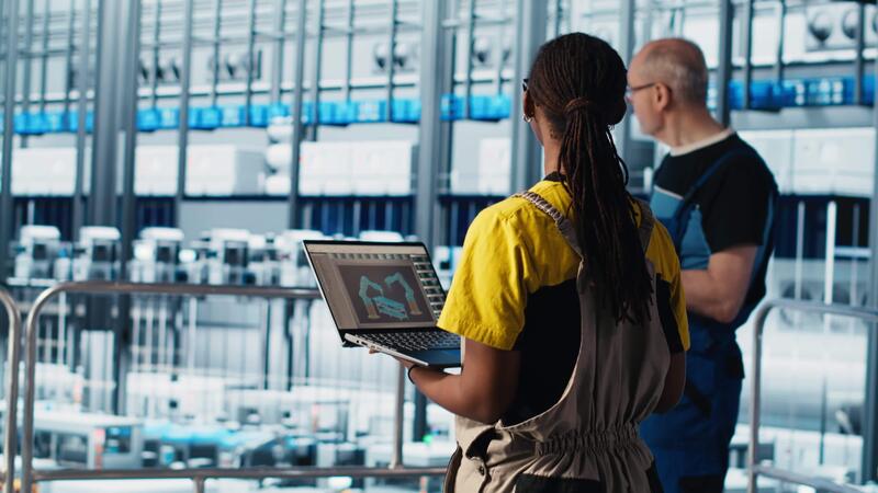 Engineering team working in smart factory, collecting and analyzing data. Teamworking colleagues using tracking software in industry 4.0 industrial plant equipped with advanced sensors, camera A Pro Video