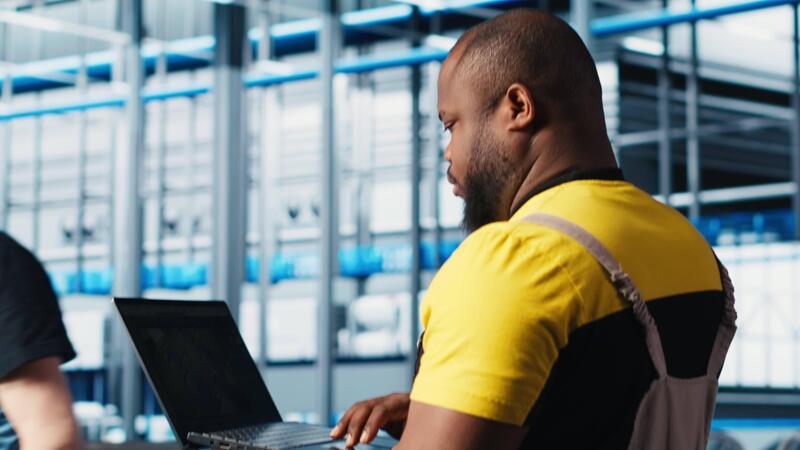 Photovoltaics smart factory technician fixing damaged IoT sensors using laptop software. Industry 4.0 solar panels plant expert using notebook find errors and reduce downtime, camera A Pro Video