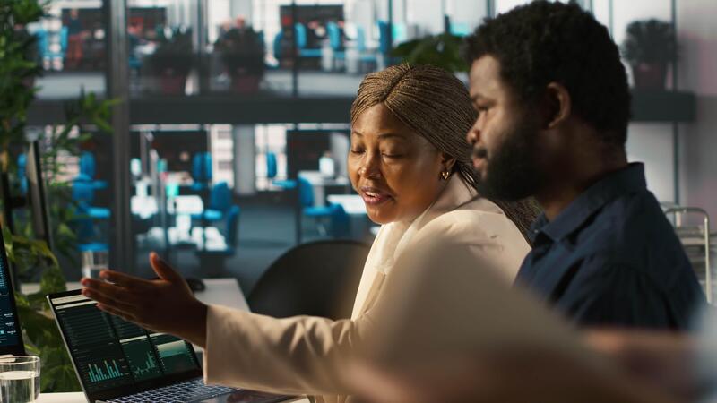 Supervisor in office discussing with employee about key performance indicators for revenue, profitability and operational efficiency. African american manager supervising employee at work, camera A Pro Video